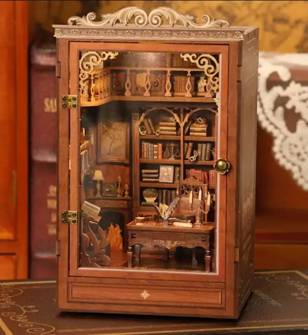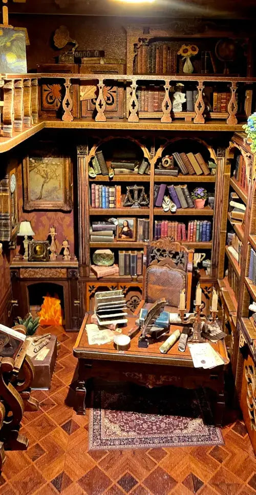 From the carved bookshelf to the warm fireplace, every corner of the Time Book House glows with craftsmanship. Touch-activated lights bring the vintage study to life.