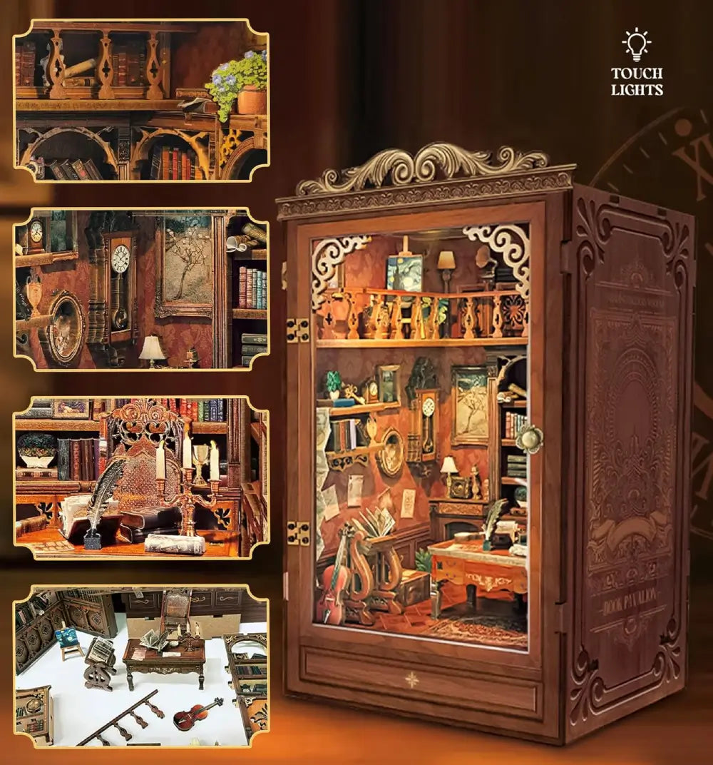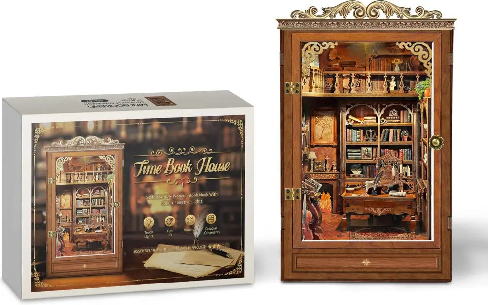 From the carved bookshelf to the warm fireplace, every corner of the Time Book House glows with craftsmanship. Touch-activated lights bring the vintage study to life.