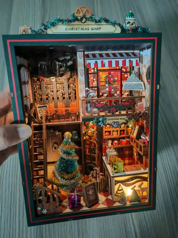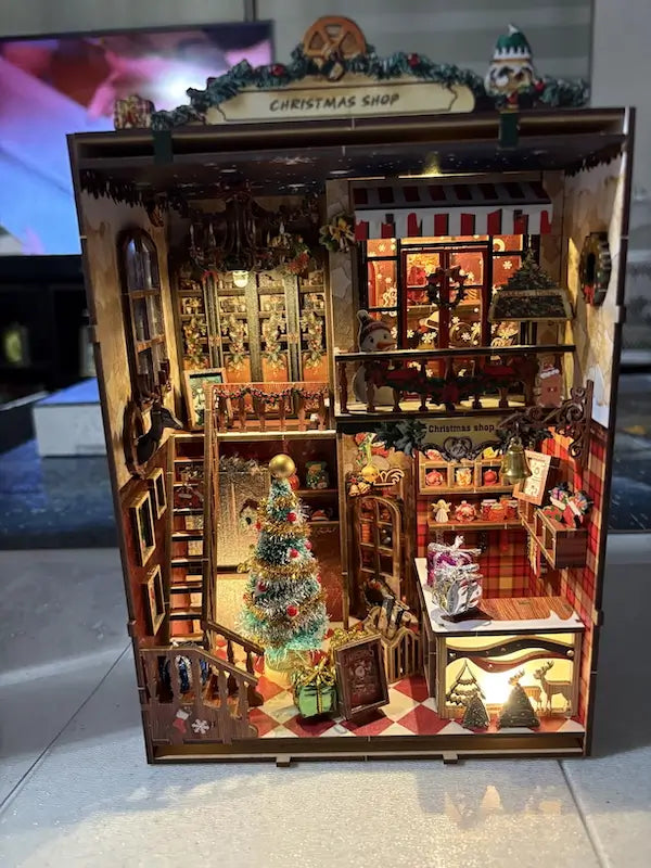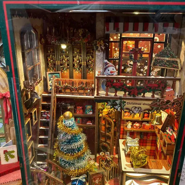 Step inside a magical holiday nook filled with glowing lights, festive ornaments, and cozy winter charm. Every detail, from the decorated tree to the tiny holiday displays, brings warmth and sparkle to your bookshelf.