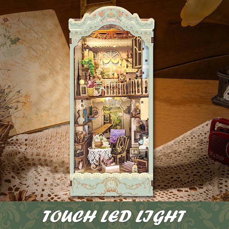The scene features realistic wooden furniture, including tables, chairs, and cabinets, all adorned with exquisite miniature books and decorative accents. A connecting staircase between floors, while a floral-covered coffee table with fresh blooms adds rustic charm. The warm glow of touch-activated ambient lighting completes this cozy, romantic setting - perfect for displaying between your favorite novels.