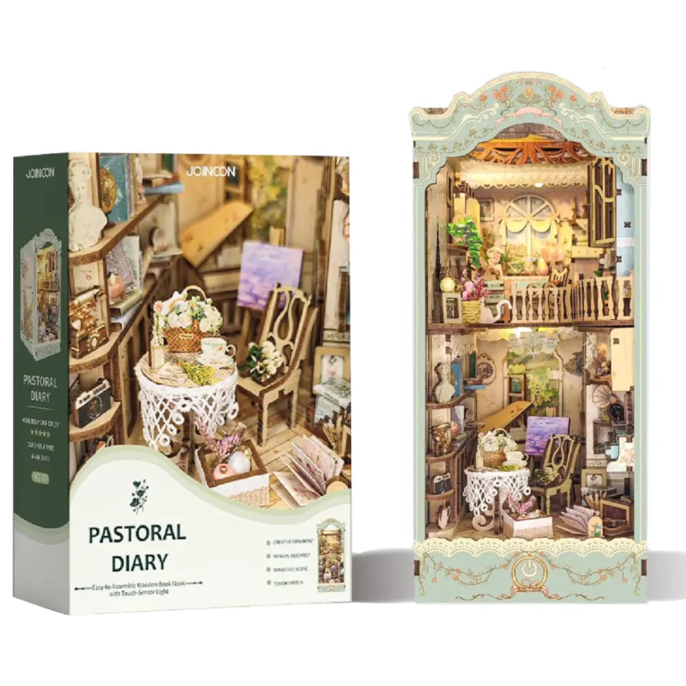 Each kit includes pre-cut, pre-painted wooden pieces, step-by-step instructions, LED lighting components, and any specialty materials needed for the scene.