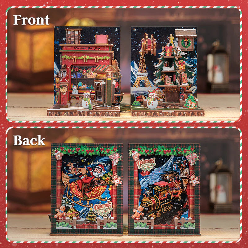 Flip it around to enjoy vibrant back panels showcasing Santa’s sleigh and a joyful holiday train. Perfect as a seasonal decoration or a creative gift!